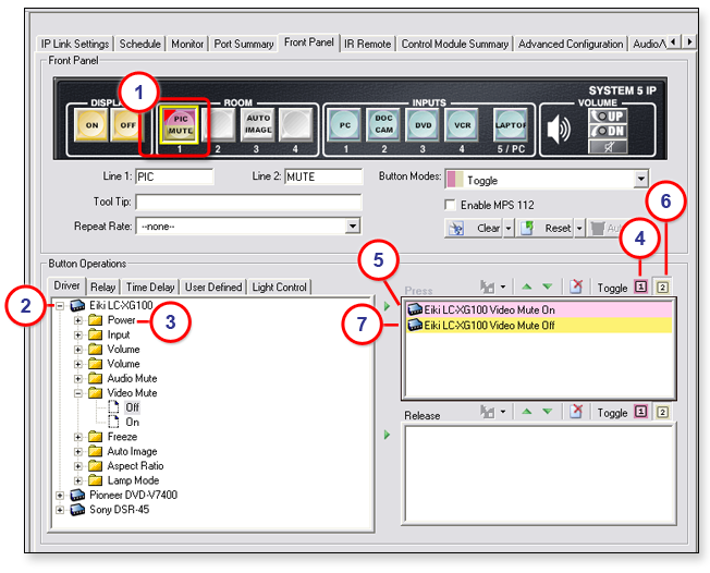 - or - Select the desired relay function and click one of the two Right Arrows (5) to move the selected relay function to the respective Press or Release section. The example below shows the result of adding a Relay