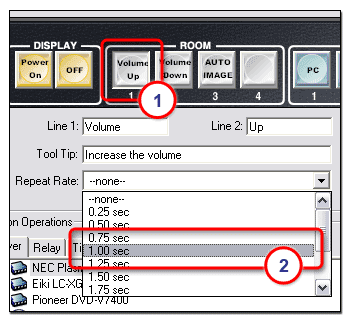 Setting a Button Repeat RateThe repeat rate is the rate at which a button repeats its function if the button is held down. ExampleIf you have configured a button as an increment volume button and given it a repeat rate of 1.00 second, as long as you keep this button pressed (the front panel button or the GlobalViewer button), the Increment Volume command is sent every 1.00 second. To set a repeat rate: