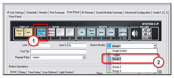 RelayThe Relay tab in the Button Operations section gives you the ability to add relay functions to a selected button. ExampleIf you want to power on a projector and lower a projector screen all with one press or release of the Display Power On button, you can:
