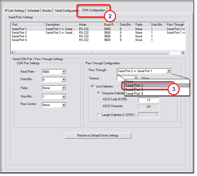 The COM Configuration tab is only present when a device port (1) is selected in the IP Link Tree window. The COM Configuration (2) tab: