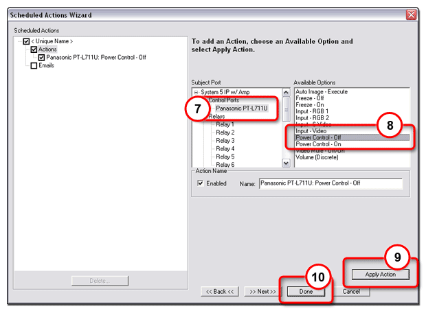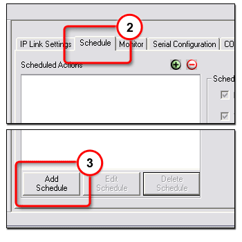 Global Configurator's scheduling feature enables you to schedule specific actions to occur for a selected device. As an example, scheduling is useful to set all network projectors to power off at the end of the day to prevent idle lamp usage. Note: The display port of a System 5 IP is shown as an example. However, the scheduling function is available for use with many other IP Link and audio/visual devices. |