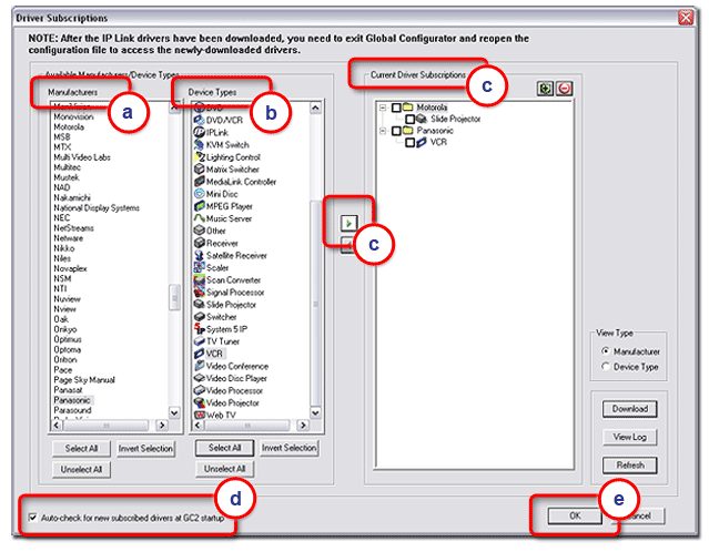 The Driver Subscription Page allows you to identify which device drivers you are using on your audio/visual network. Then, each time Global Configurator starts it automatically checks for updates to your selected drivers. |
