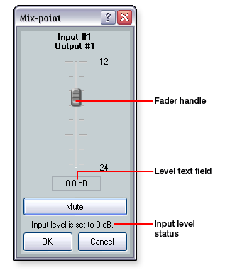 Mix-point Dialog Box ComponentsTo open the mic Mix-point dialog box, double-click a mic mix-point. You can use this dialog box to adjust the mix levels to the left and right stereo bus. The gain range is -24 dB to +12 dB. In the mix-point dialog box, you can view the level or mute status of the line input GAIN block. The reported information can be used as a reference when setting mix-point levels. To mute the signal to the bus, click the Mute button. To adjust the fader: