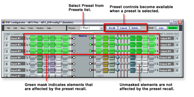 Previewing and Recalling a PresetYou can preview a preset in Emulate mode or Live mode by selecting a preset from the Presets drop-down list on the DSP Configurator menu bar. In Live mode, DSP Configurator reads the preset selections from the device. In Emulate mode, the application accesses the presets contained in the current configuration file. In this preview state, you cannot make any changes to an element in DSP Configurator. In Live mode, real-time changes to the current state are not reflected in DSP Configurator while in this preview state. After you select a preset from the Presets drop-down list, the application indicates that you are viewing a preset configuration by displaying the preset elements (those which will be affected by a preset recall) with a green translucent mask layer in the workspace. Elements without a translucent mask represent the elements in the current state (Live mode) or current emulation (Emulate mode) that will be unaffected by a preset recall.