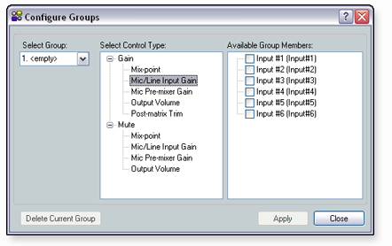 - or - From the View menu, select Group Controls and click Add a Group in the Group Controls dialog box. The Configure Groups dialog box opens. - or - From the View menu, select Group Controls to open the Group Controls dialog box. Then, double-click one of the displayed group controls to open the Configure Group dialog box. The Configure Group dialog box opens to the selected group master, expanding the associated control type tree to show the group members.