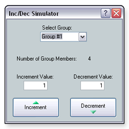 The Increment/Decrement Simulator allows you to set the increment and decrement values, providing control of increment and decrement adjustment. This control is temporary because the increment or decrement value is not stored in the device. The default value is 1. To use the Increment/Decrement Simulator: