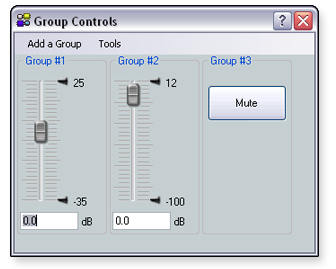 Add a GroupClicking the Add a Group option in the Group Controls dialog box opens the Configure Groups dialog box. After you add a new group and click Apply in the Configure Groups dialog box, the Group Controls window refreshes to display the added control. See the Configuring Groups subsection above for the procedure to add and configure groups. |