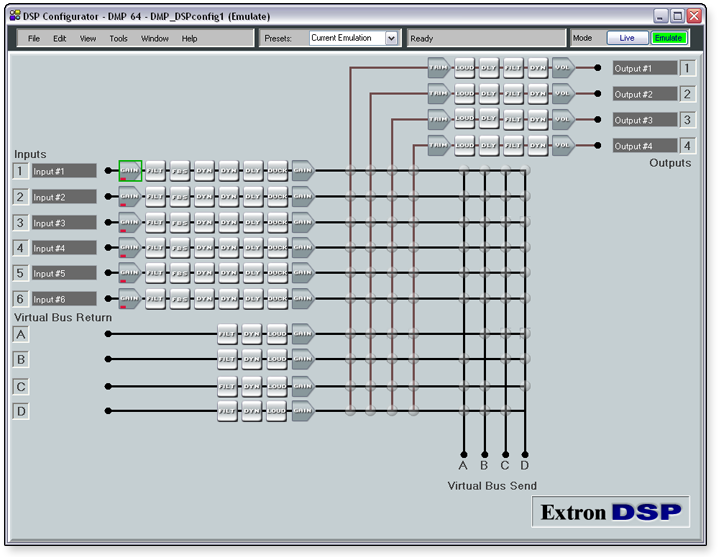 Audio I/O WorkspaceIn the Audio I/O workspace for the DMP 64, you can access all audio gain, trim, and volume controls as well as audio DSP processors. You can also configure mix-points that connect mic/line inputs and virtual bus returns to line outputs. A secondary mix matrix connects line input, mic input, and virtual bus return signals to the Virtual Bus Sends. See the Mix