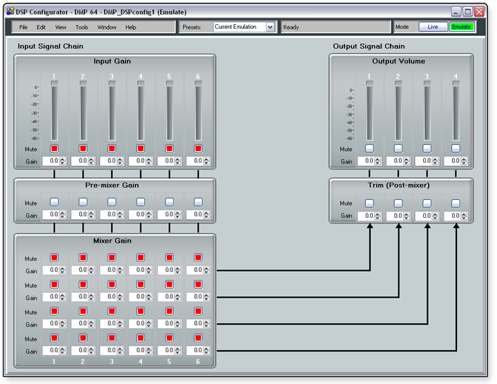 DSP Configurator has several workspaces that provide a set of controls for all input and output signal paths inside the main application window. Within these workspaces you can configure and monitor all settings related to audio. See the subsections below for a description of the workspaces that are available for the DMP 64. |