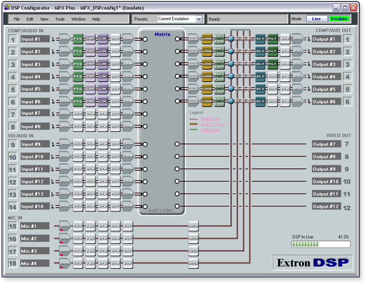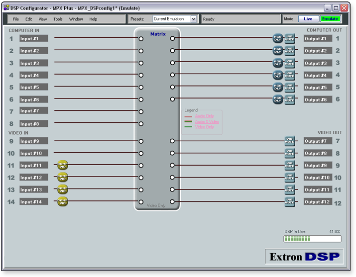 Audio & Video I/O WorkspaceDSP Configurator defaults to the Audio & Video I/O workspace when the application launches. To open this workspace from another workspace, you can select Audio & Video I/O from the View menu or press <F2> on your keyboard. Alternatively, you can click Audio & Video I/O in the Legend section of the workspace you are viewing. In the Audio & Video I/O workspace, you can access the audio and video switching matrix and all audio gain, trim, and volume controls. You can also access all audio DSP signal processors. See the Switcher Matrix Operation section