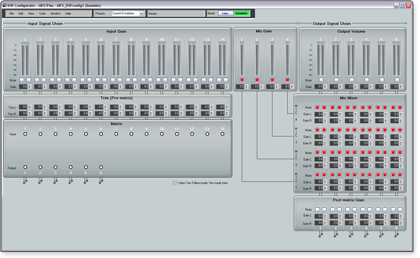 DSP Configurator has several workspaces that provide a set of controls for all input and output signal paths inside the main application window. Within these workspaces you can configure and monitor all settings related to audio and video such as audio gain, trim, volume controls, and video format. See the subsections below for a description of the workspaces that are available for the MPX Plus 866 A. |