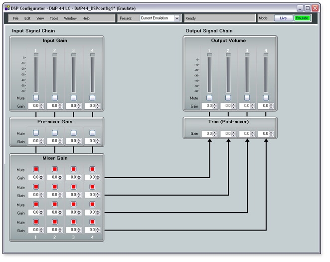 In the Audio I/O workspace for the DMP 44 LC, you can access all audio, gain, trim, and volume controls as well as audio DSP processors. You can also configure mix-points that connect line level inputs to line level outputs.