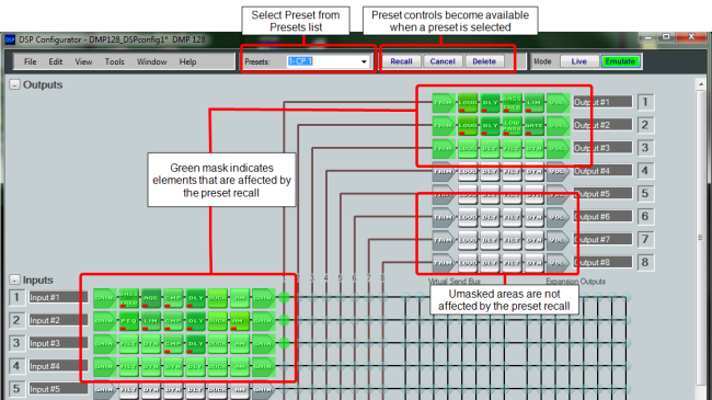 After you select a preset from the Presets drop-down list, the application indicates that you are viewing a preset configuration by displaying the preset elements (those which will be affected by a preset recall) with a green translucent mask layer in the workspace. Elements without a translucent mask represent the elements in the current state (Live mode) or current emulation (Emulate mode) that will be unaffected by a preset recall.