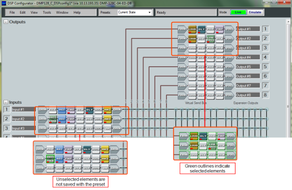 First, create a configuration from which you want to save a preset. In Emulate mode, you are working from the current emulation. In Live mode, you are working from the current state of the device. To build a preset, you must first select the elements to be saved.