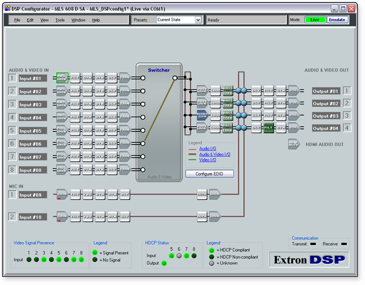 DSP Configurator has several workspaces that provide a set of controls for all input and output signal paths inside the main application window. Within these workspaces you can configure and monitor all settings related to audio and video such as audio gain, trim, volume controls, and video format.