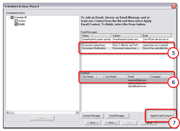 The Contact Manager button opens a dialog box that allows you to add new e-mail contacts. The Email Manager button opens a dialog box that allows you to create new custom e-mails that can be scheduled for delivery. |