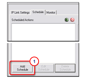 The Schedule tab is used to set scheduled actions and e-mail deliveries. A single schedule can include both actions and e-mail assignments. Actions vary by selected device and include options such as Power On, Power Off, Volume Up, Volume Down, Mute On, and Mute Off. Custom e-mails can be created and sent to specified e-mail addresses following scheduled events. Use the |