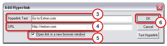 2. Enter unique hyperlink text (such as Go to Extron.com).