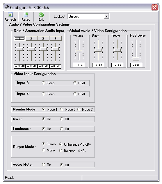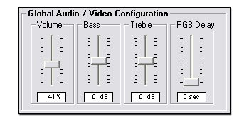 Global Audio / Video ConfigurationThe Global Audio / Video Configuration section provides Volume, Bass, and Treble controls that affect all of the audio channels on the AV switcher. The controls also provide RGB Delay (Triple-Action Switching Triple-Action Switching is when the RGB input signal is muted during switching until the projector has time to sync up to the new image. |