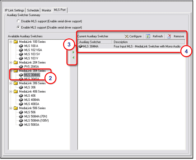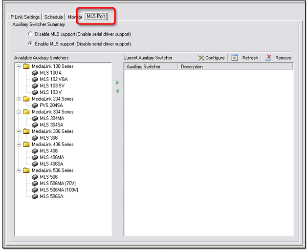 The MLS Port tab is used to add an AV switcher to your network configuration. This switcher is used with a MediaLink Controller (MLC) to: