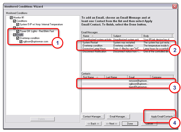 4. Click the Apply Email/Contacts button.  The new e-mail distribution appears under the Emails branch in the Monitored Conditions section.