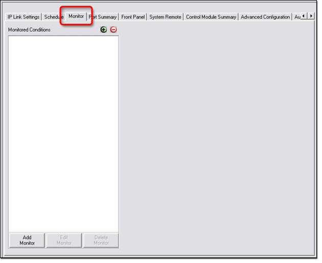 The Monitor tab is used to respond with an action or e-mail to a specified condition or event.