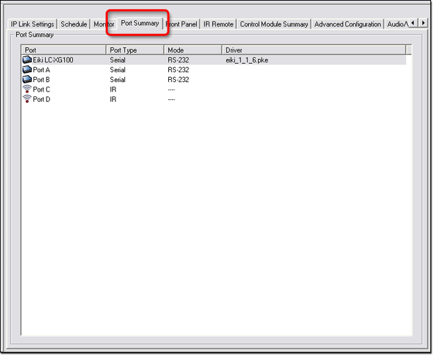 The Port Summary tab is a view-only screen displaying the port type, mode, and selected driver for each port of the device selected in the IP Link® Tree window.