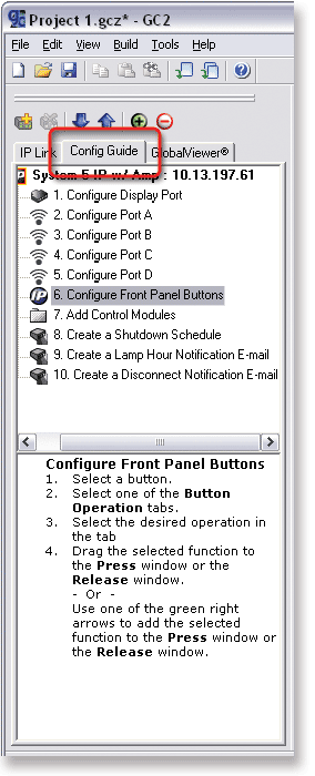 The Config Guide tab in the IP Link Tree window displays step-by-step instructions for adding and configuring devices or setting up specific functions in your Global Configurator project file. Each time you select a port in the top half of the window, the instructions in the lower half of the window change to reflect the steps necessary to add and configure a device or set up a specific function on the selected port. |