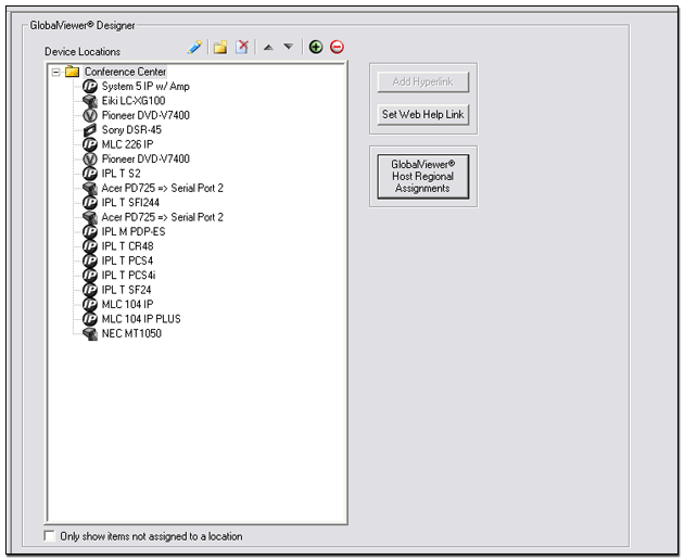 Select this tab to display the GlobalViewer Tree (see below).  Devices that are copied from the IP Link Tree window to the GlobalViewer Tree section in the Global Configurator window can be viewed and configured using the web-based GlobalViewer interface.