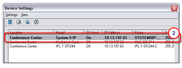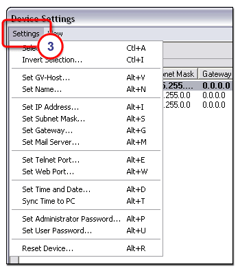 Use the Change Device Settings option to open the Device Settings screen and display the following information for each device: location, model, GV host, IP address, name, subnet mask, gateway, mail server, mail domain, Telnet port, web port, admin password, user password, daylight savings, and time zone. The Device Settings screen scrolls horizontally to display all of the information. |