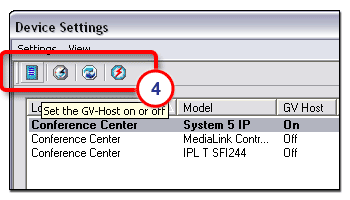 Device Settings ToolbarNote: Each of these options is also available in the Settings drop-down list. Device Settings toolbar icons (4) include: |