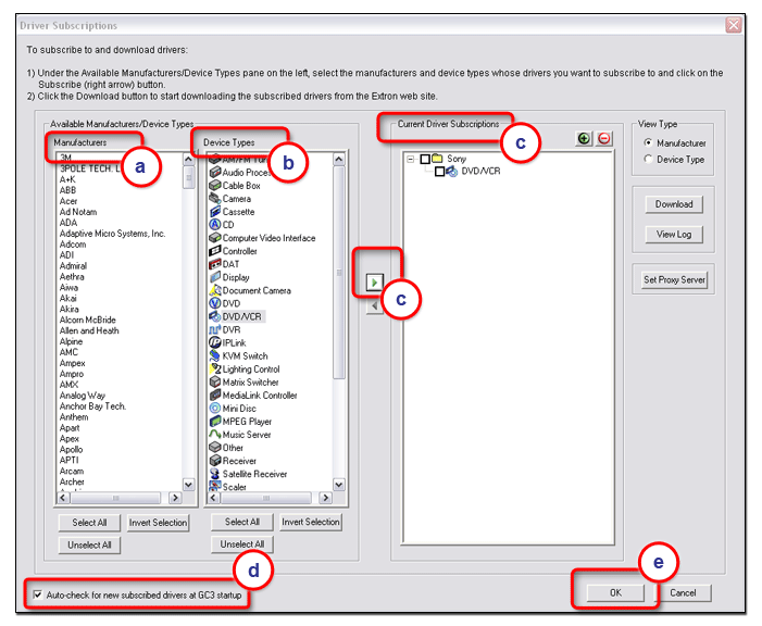 5. Click OK.  Each time you launch Global Configurator, it checks for and downloads the latest revisions of the selected drivers from www.extron.com.