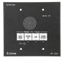 The Extron IPI 204 Four-Button Standalone IP Intercom Module connects to the network using standard Ethernet protocols and is used with the free Extron IP Intercom HelpDesk software enabling help desk support for the classroom.