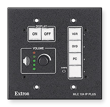 The Extron MLC 104 IP Plus MediaLink Controller with built-in IP Link Ethernet Control is an easy-to-use control panel for any small classroom or meeting room.  It is designed to control a wide range of smaller A/V systems and enables web-based remote diagnostics, asset management, and support. The MLC 104 IP Plus standardizes the control interface for all systems, making display systems simple to use. Standardization also makes setup and maintenance easier to support.