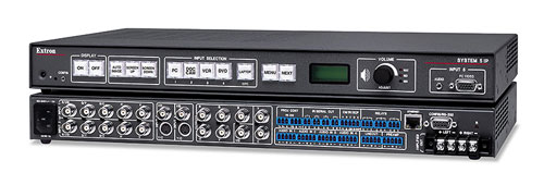 The Extron System 5 IP is a five input, one output integrated A/V active switcher that provides an all-in-one, affordable solution for single projector A/V installations in classrooms, boardrooms, conference rooms, and multimedia environments. It includes such features as configurable inputs, easy-to-use IR learning, customized display control via RS-232, relays for room control, an integrated 40-watt, rms, audio amplifier, and IP Link Ethernet monitoring and control.