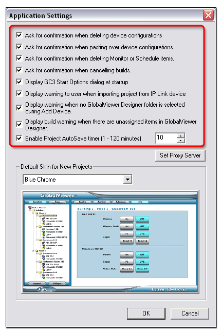 Use the Default Skin for New Projects drop-down list to change the look and feel of the GlobalViewer interface.