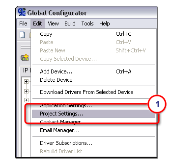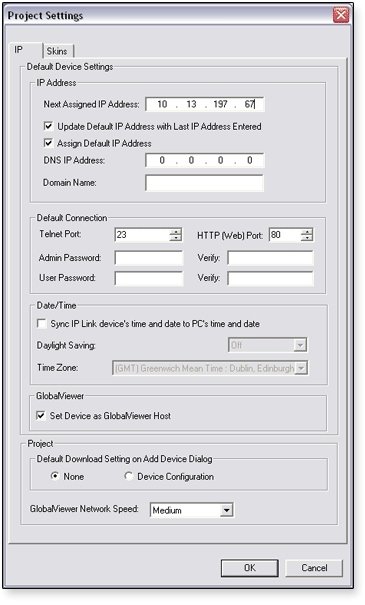 The Project Settings screen opens with the following options on the IP tab: Update Default IP Address with Last IP Address Entered Default Connection Telnet Port Default Connection Web Port Default Admin Password Default Download Setting on Add Device Dialog