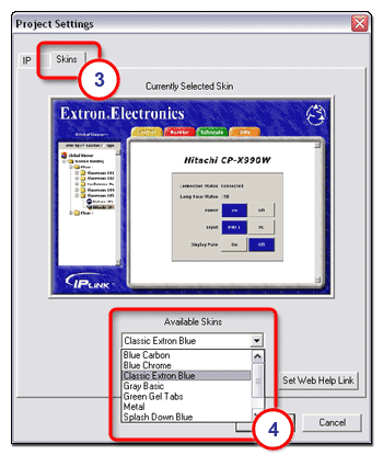 Use the Skins tab (3) and Available Skins drop-down list (4) to select the look and feel of the GlobalViewer interface. Skins options include:
