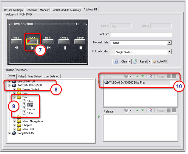 4. Click and drag the selected button operation to either the Press or Release section.  A red triangle in the top, left corner of the associated button (7) indicates that the button has been configured.