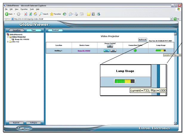 Edit Max Lamp HoursOn the GlobalViewer Video Projector Type summary page is a Lamp Usage bar graph indicator. When a device driver is installed for a video projector, it provides the maximum value to be used by the bar graph (Max=1000 in the example below). The Edit Max Lamp Hours button opens a dialog box that allows you to adjust the maximum value in the bar graph. |