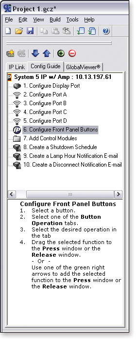The Config Guide tab in the IP Link Tree window displays step-by-step instructions for adding and configuring devices or setting up specific functions in your Global Configurator project file.