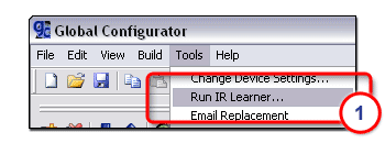 The IR Learner application must be downloaded from the Extron website before the Run IR Learner option (1) is available on the Tools menu.